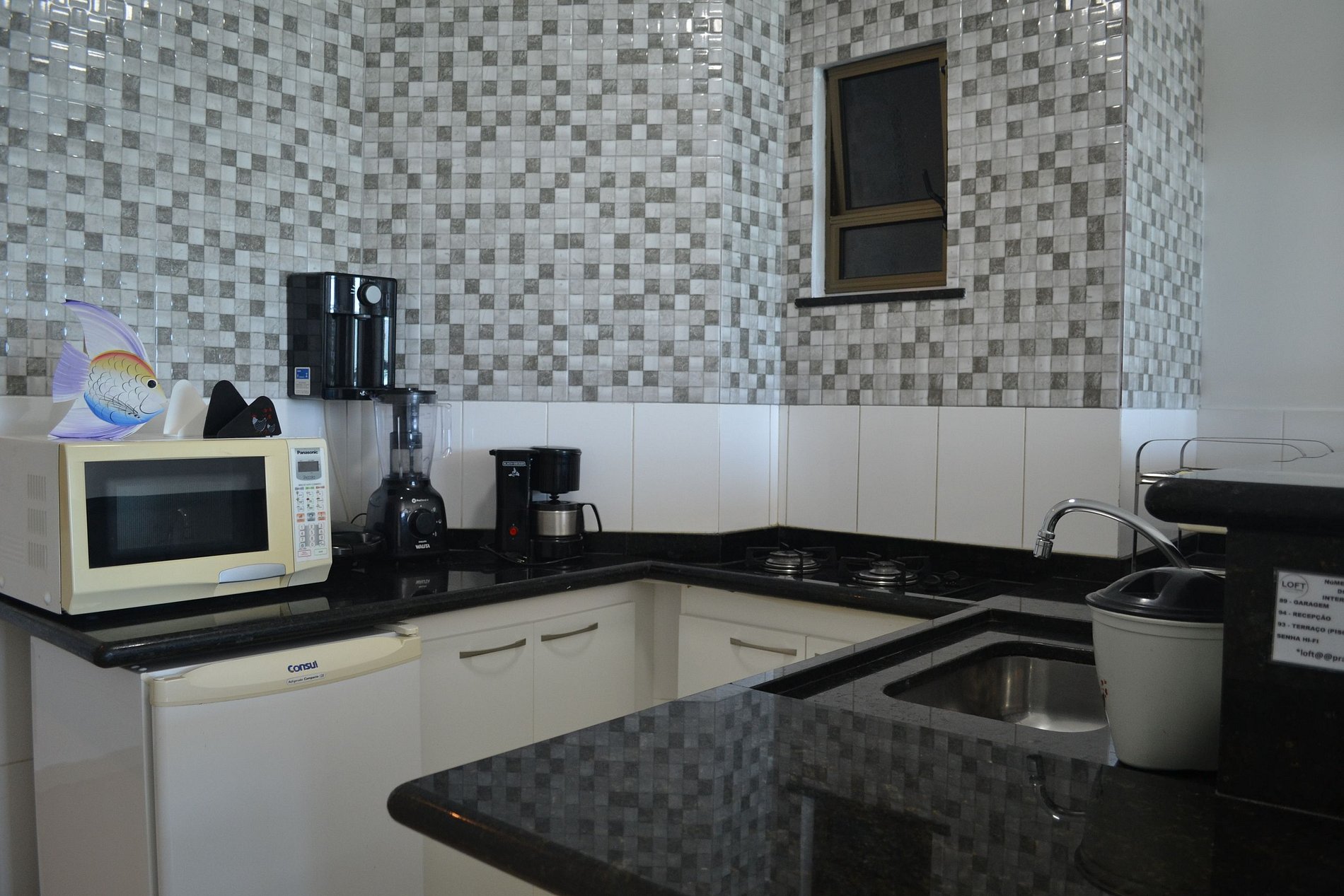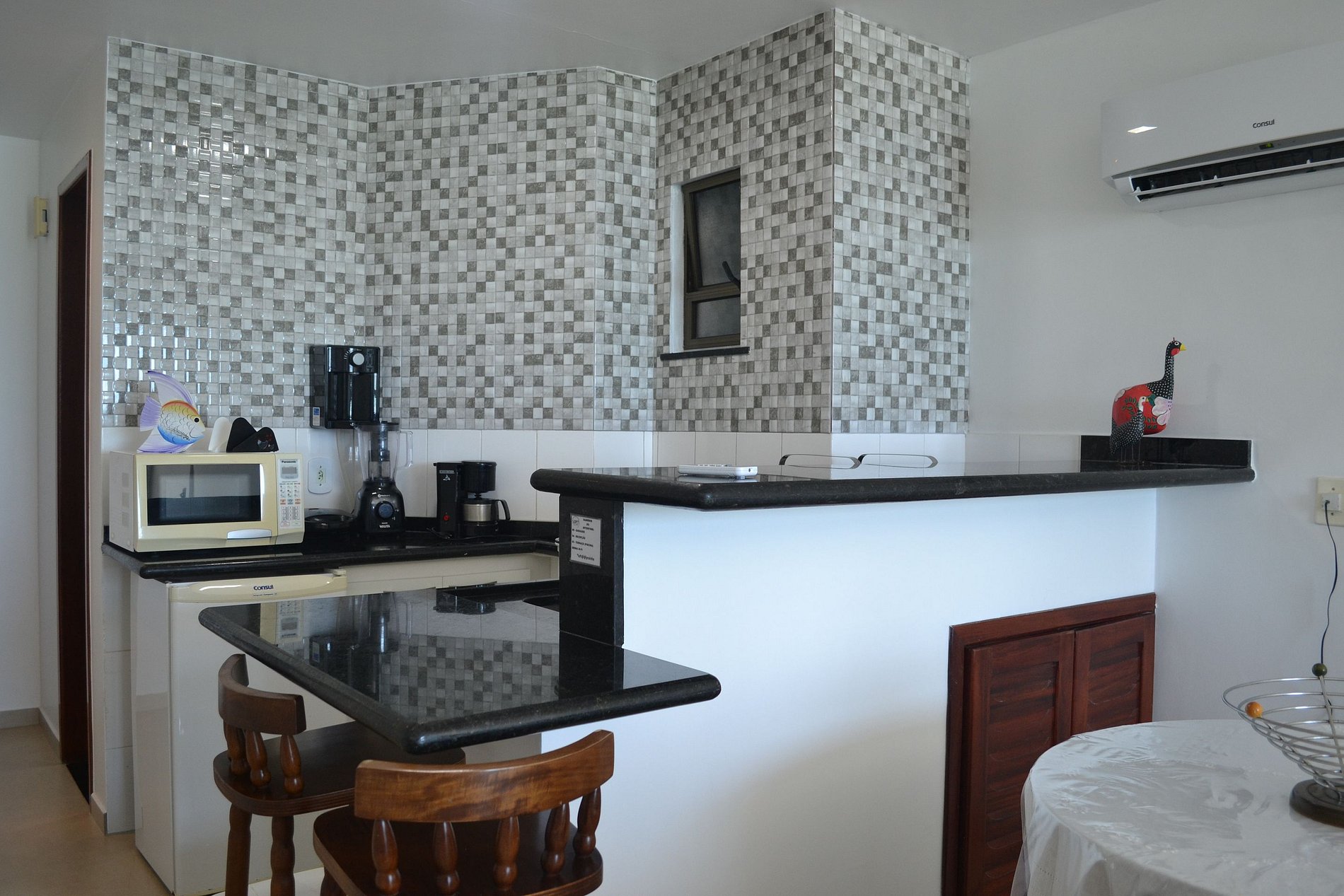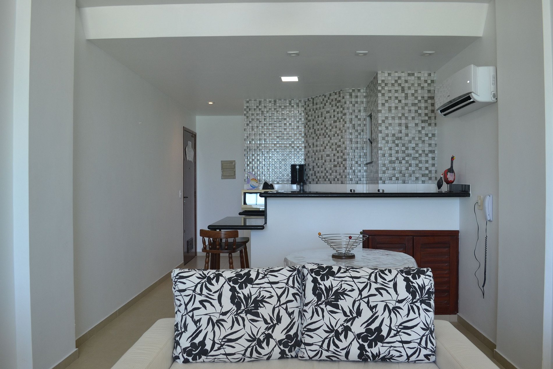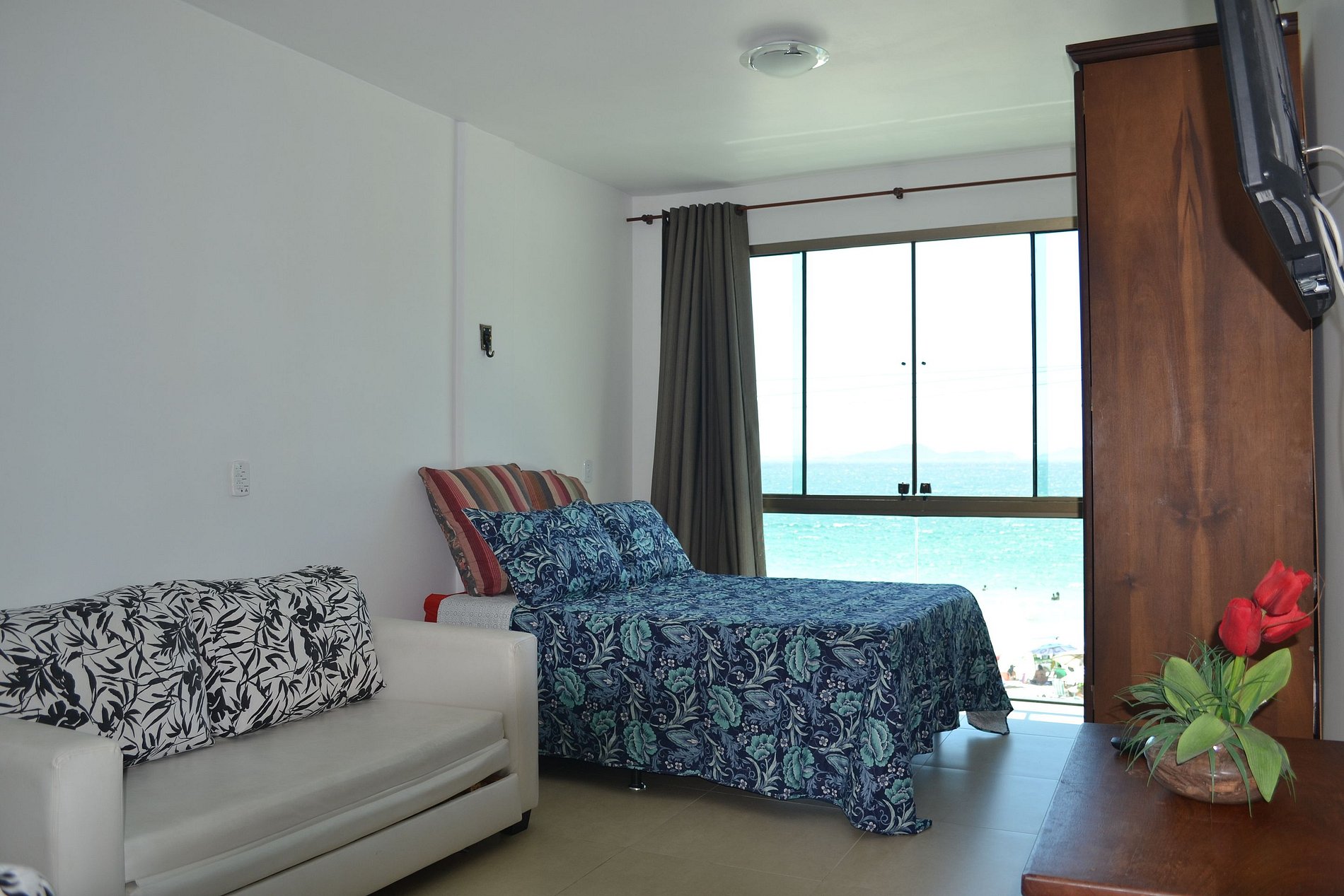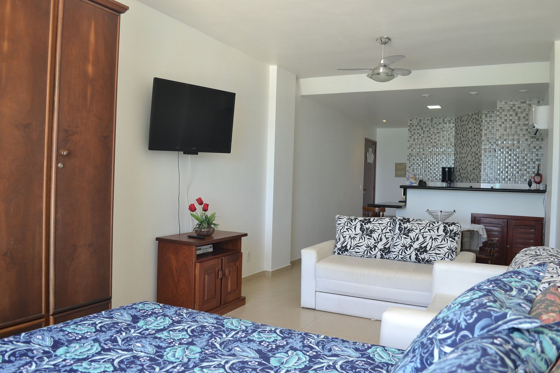 O apartamento tem ambiente único entre quarto, sala e cozinha americana e um banheiro privativo. Dispõem de cama de casal, cama de solteiro, sofá-cama de casal, tv,, ar condicionado, cozinha equipada com cooktop, frigobar, microondas, cafeteira, sanduicheira, liquidificador, panelas, louça e utensílios.