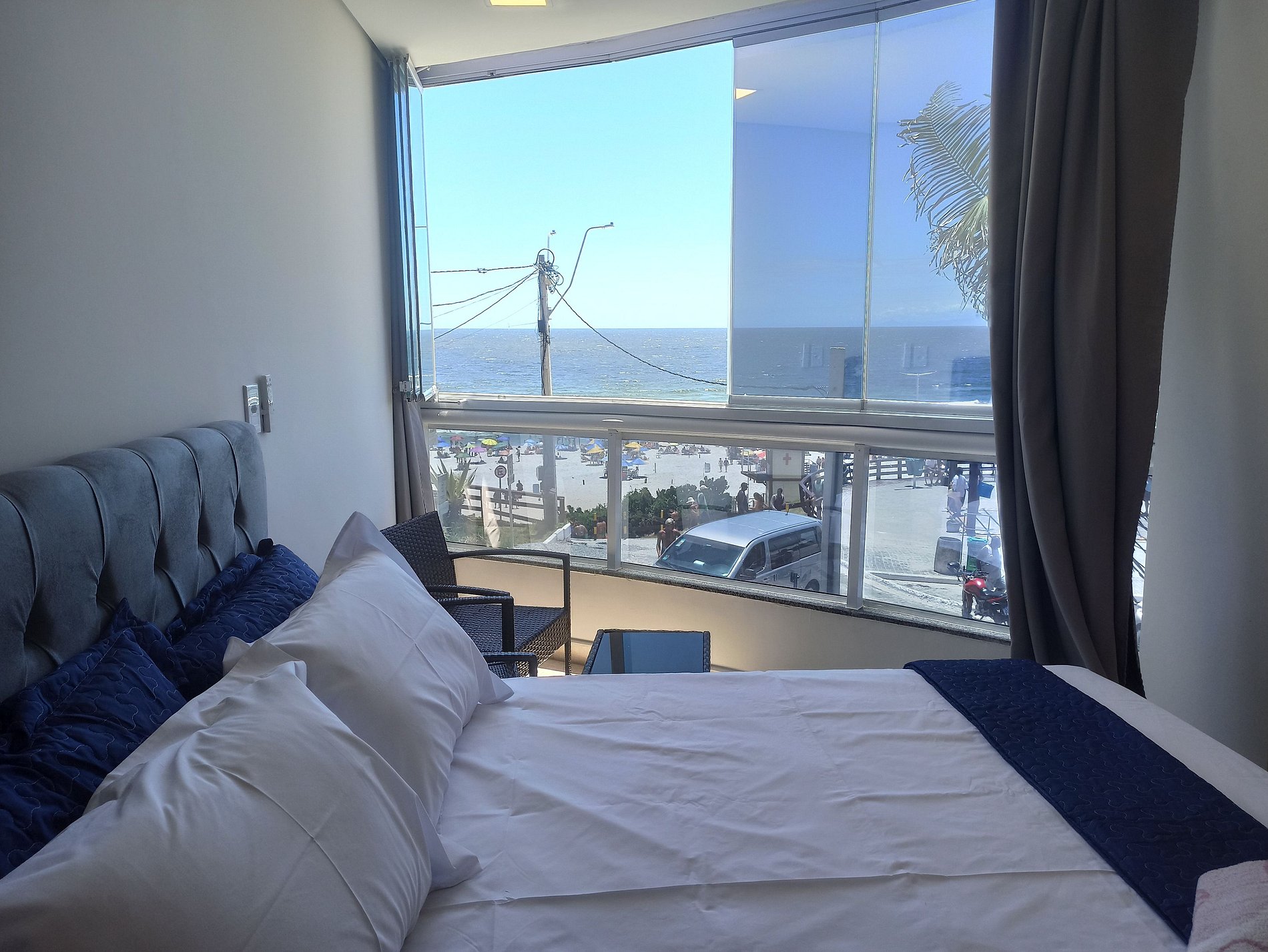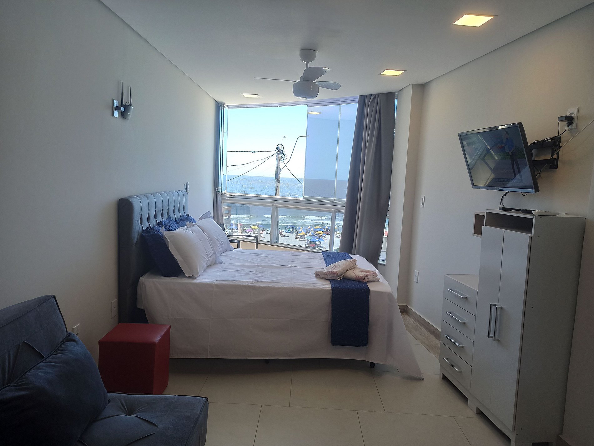 Os apartamentos têm vista de frente para a praia e contam com:
