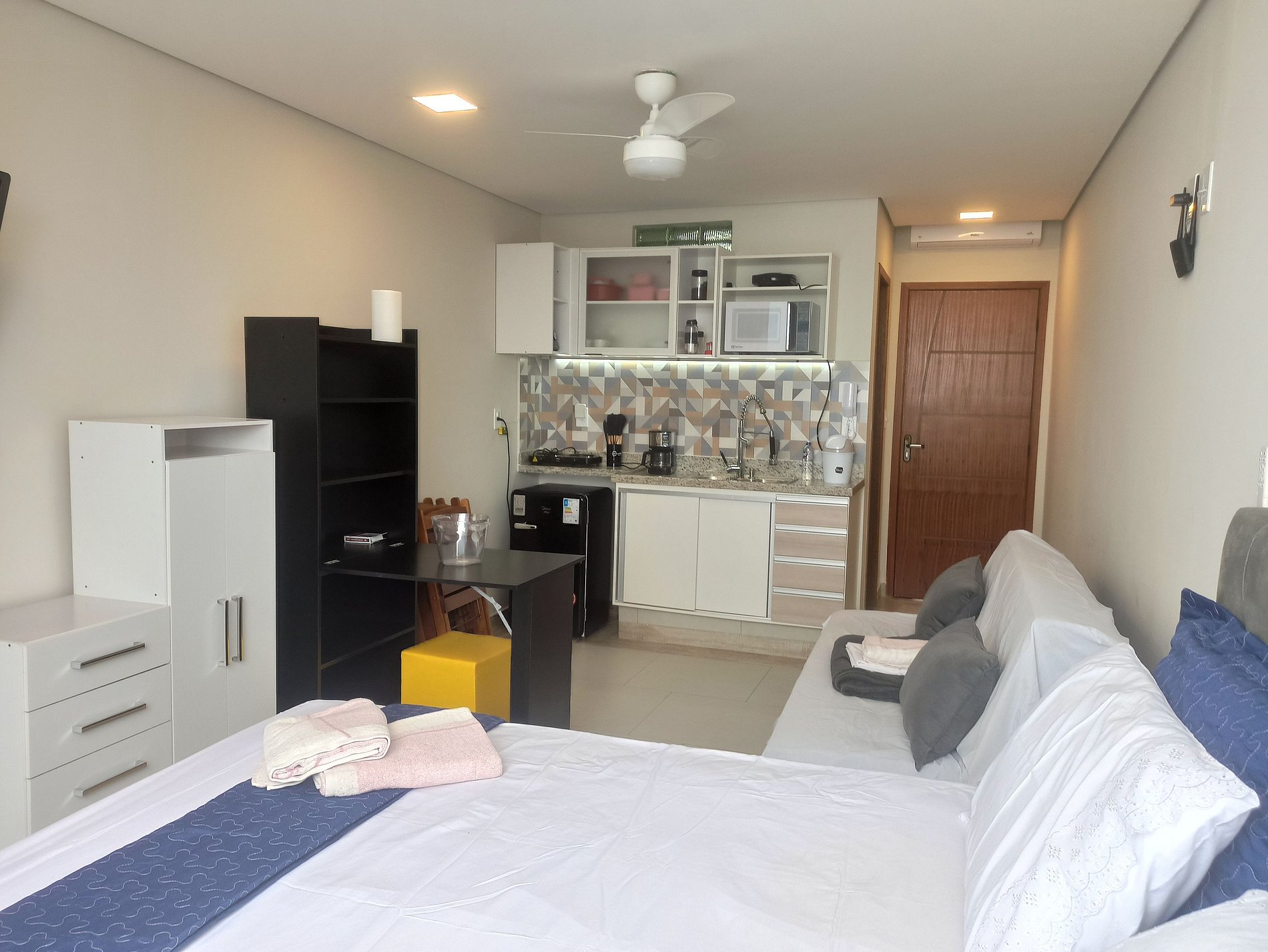 Studio decorado para sua estadia e perfeito para casais ou famílias, com estrutura para até 4 pessoas. Apartamento do tipo pé na areia, basta atravessar a rua. Farmácia, padaria, mercados a 5 minutos andando.